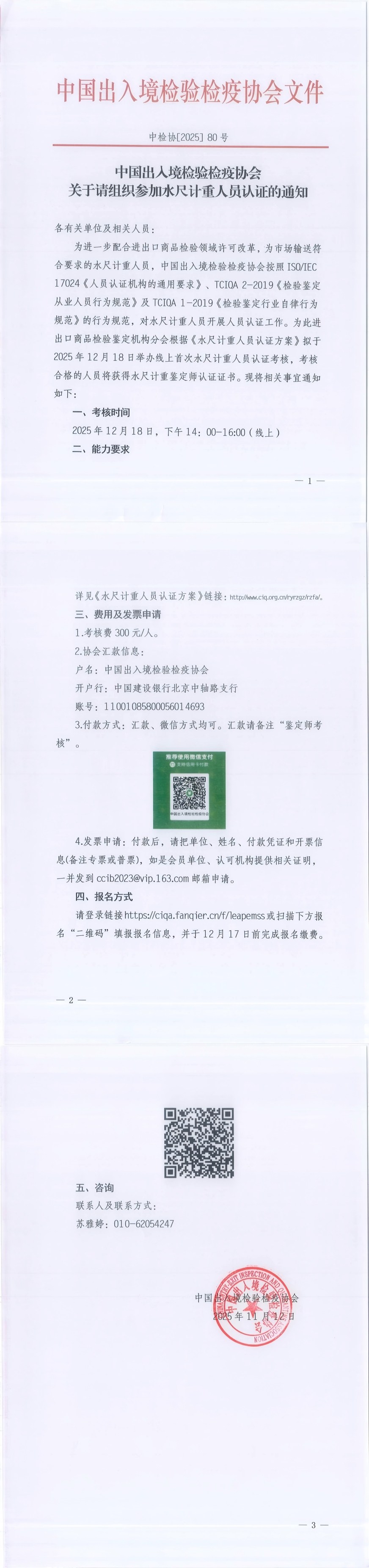 您现在的位置是:首页 > 工作动态 中国出入境检验检疫协会关于请组织参加水尺计重人员认证的通知 发布日期:2025-11-13 字体: 【小】 【中】 【大】 相关附件: 中国出入境检验检疫协会关于请组织参加水尺计重人员认证的通知.pdf 分享: 热门文章: 中国出入境检验检疫协会参加第八届中国国际进口博览会及相关活动[2025-11-11] 亚太(广州)宠物水族交易会在广州召开[2025-11-10] 王新会长应邀出席加拿大肉类推广办公室在华成立活动[2025-10-30] 中澳熏蒸技术培训顺利举办[2025-10-30] 中国出入境检验检疫协会在沪成功举办认可技术培训班[2025-10-27] 海关资讯 海关总署公告2025年第219号丨关于进境农产品境外企业申报管理有关要求的公告 中国与北欧国家贸易持续增长 今年前三季度达424.3亿美元 前10个月我国货物出口总值增长6.2% 进口连续5个月保持增长 今年前三季度中国与北欧国家贸易总值达424.3亿美元 态势稳、韧性强——解读前10个月我国外贸进出口数据 今年我国进出口连续9个月保持增长 前10个月货物贸易进出口平稳增长 前10月货物贸易进出口增长3.6%