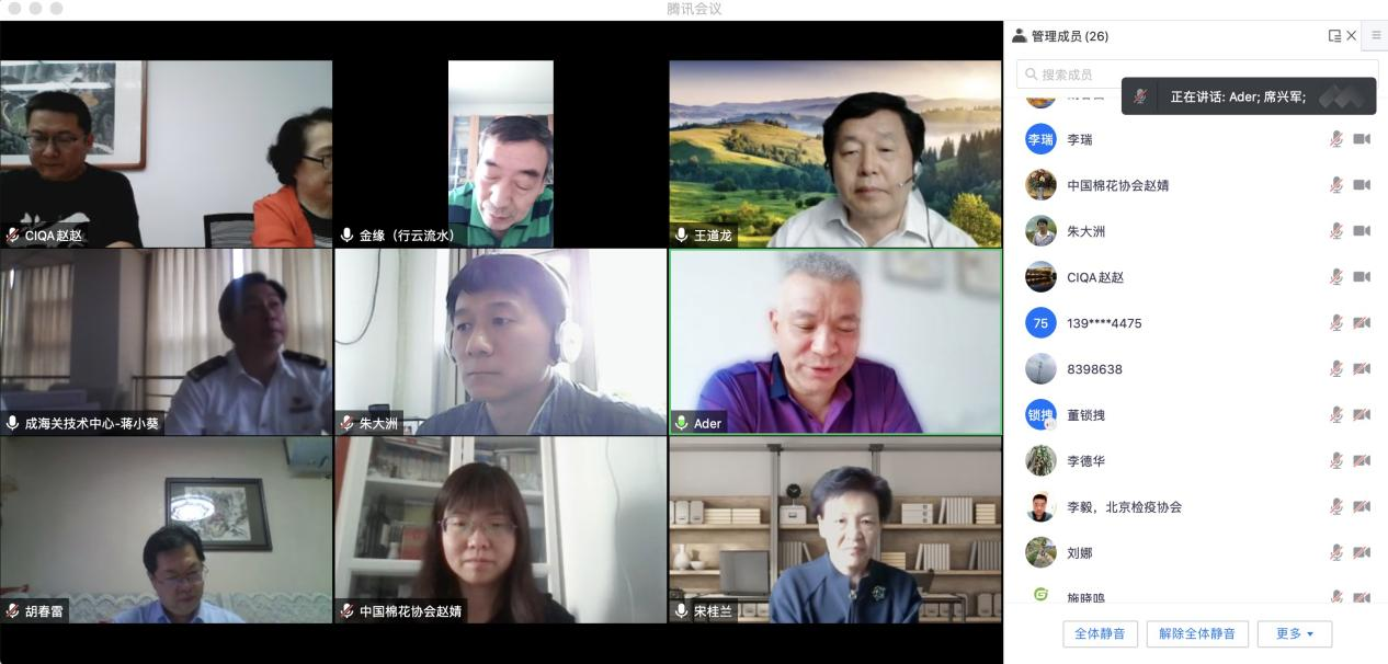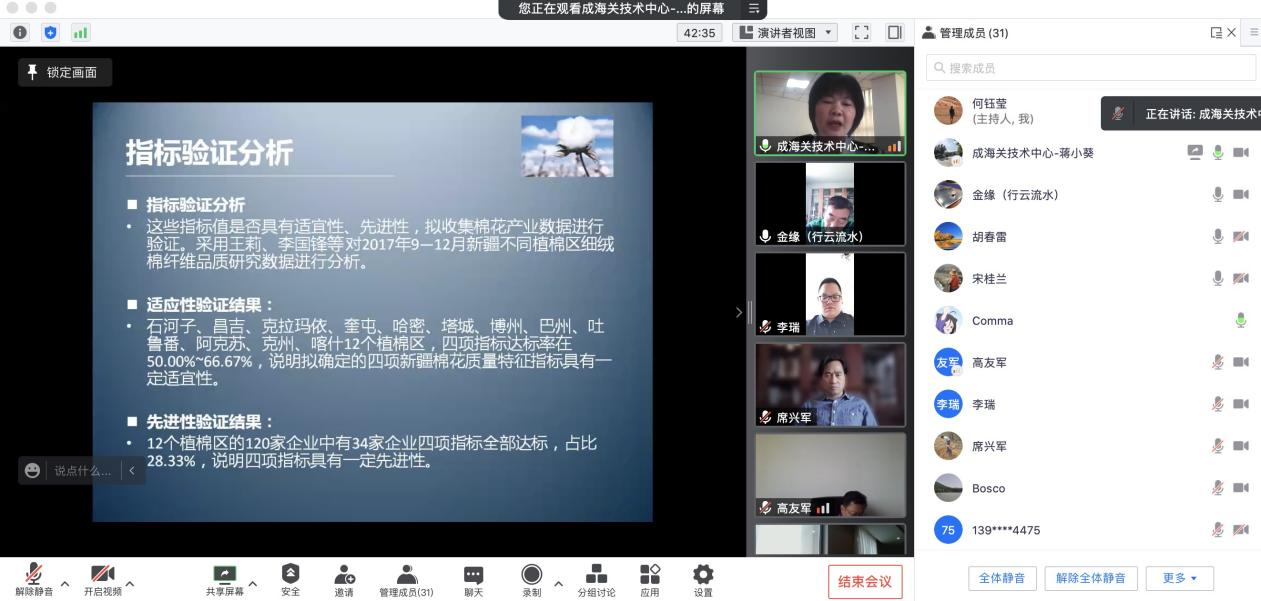 近期,中国出入境检验检疫协会生态原产地产品标准化技术委员会(CIQA/TC4)在线上组织召开了《生态原产地产品 新疆棉花技术要求及评价准则》团体标准技术审查会。会议由CIQA/TC4王道龙主席主持会议,审查会专家由中国出入境检验检疫协会、中国农科院棉花所、中国合格评定国家认可委员会、中国纤维质量监测中心、全国棉花加工标准化技术委员会、中国棉花协会、新疆利华(集团)股份有限公司、河北出入境检验检疫局等单位的8位专家以及江苏国健物码科技有限公司、北京出入境检验检疫协会等多家TC成员单位组成。标准起草小组成员单位,新疆维吾尔自治区纤维质量监测中心、成都海关技术中心、南昌海关等单位参与本次技术审查会。